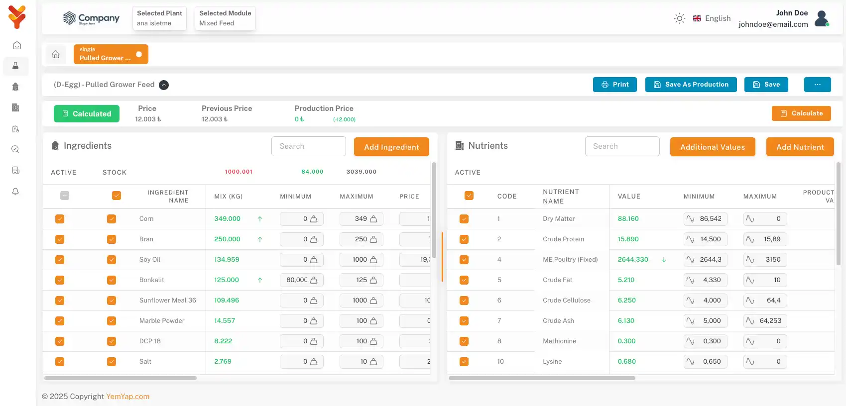 En yüksek besin değerine sahip yem formüllerini saniyeler içinde en düşük maliyetle oluşturun. Güçlü optimizasyon motorumuzla hammaddelerin verimliliğini ve karlılığınızı en üst düzeye çıkarın.